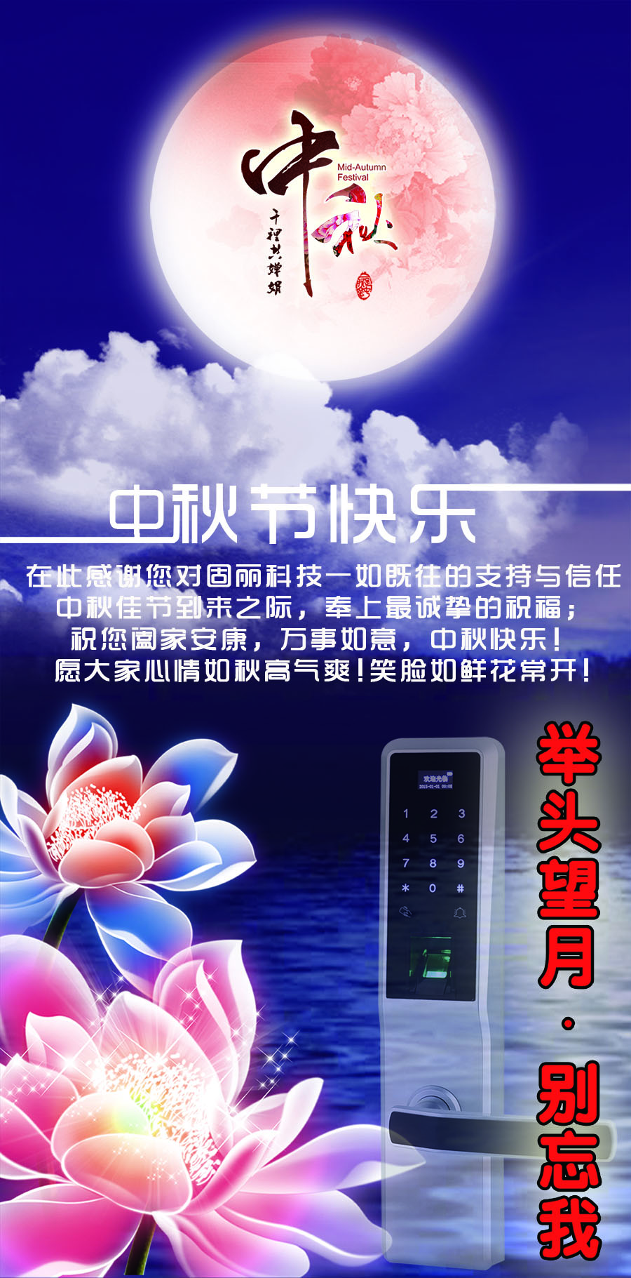 尊敬的客戶:感謝您對(duì)固麗科技長(zhǎng)期以來(lái)的支持和厚愛(ài),月到中秋分外明,又是一年團(tuán)圓日。在這中秋月圓之際,在這親朋團(tuán)圓之日,我公司為您送上誠(chéng)摯的祝福,祝您身體健康,事業(yè)興旺,笑臉相伴,生意興隆,中秋月圓,美夢(mèng)成真!祝您及您的家人中秋快樂(lè),幸福美滿!